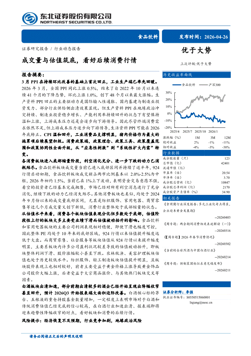 食品饮料行业:东北证券-食品饮料行业:成交量与估值筑底,看好后续消费行情-260426