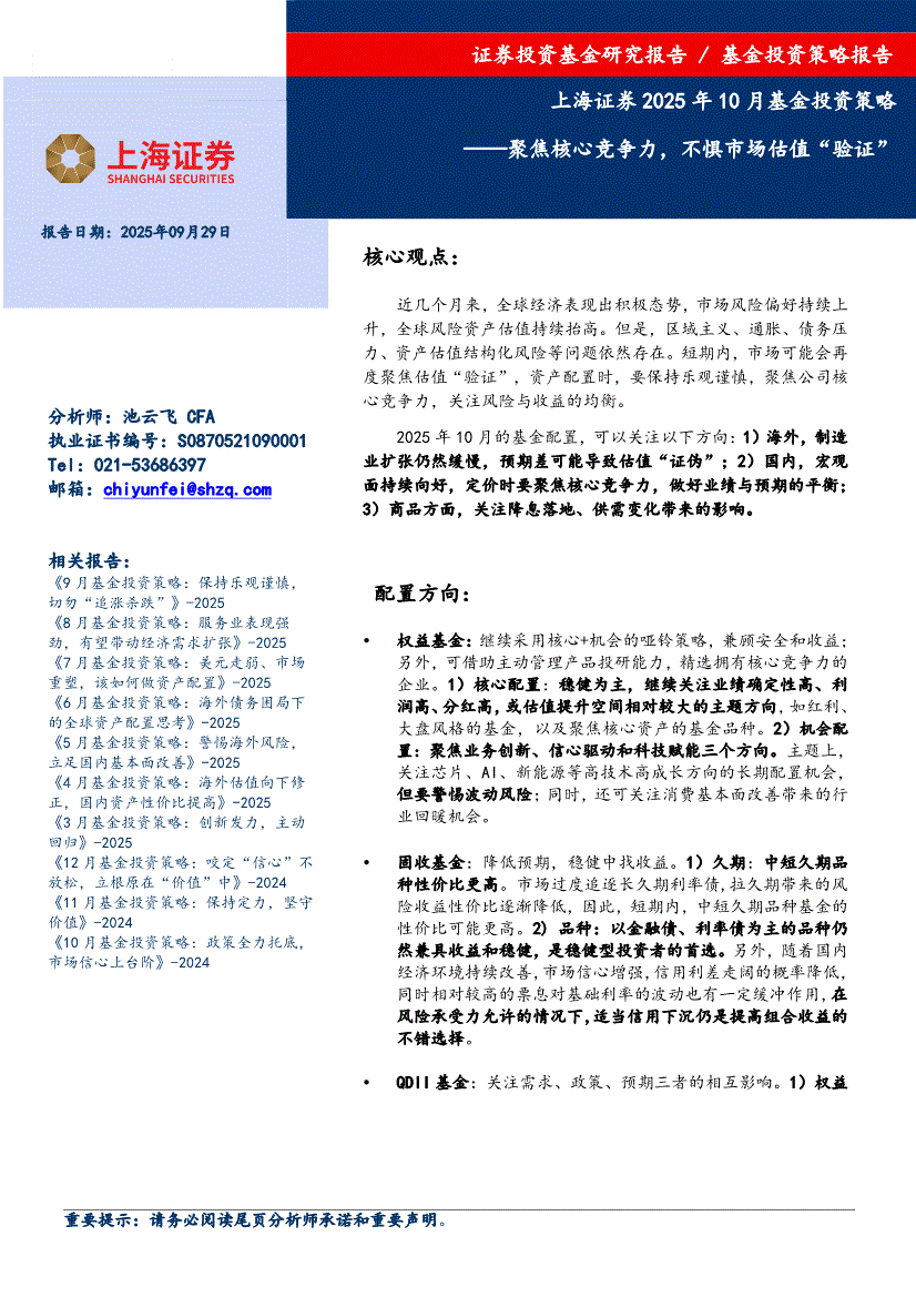 上海证券-2025年10月基金投资策略:聚焦核心竞争力,不惧市场估值“验证”-250929