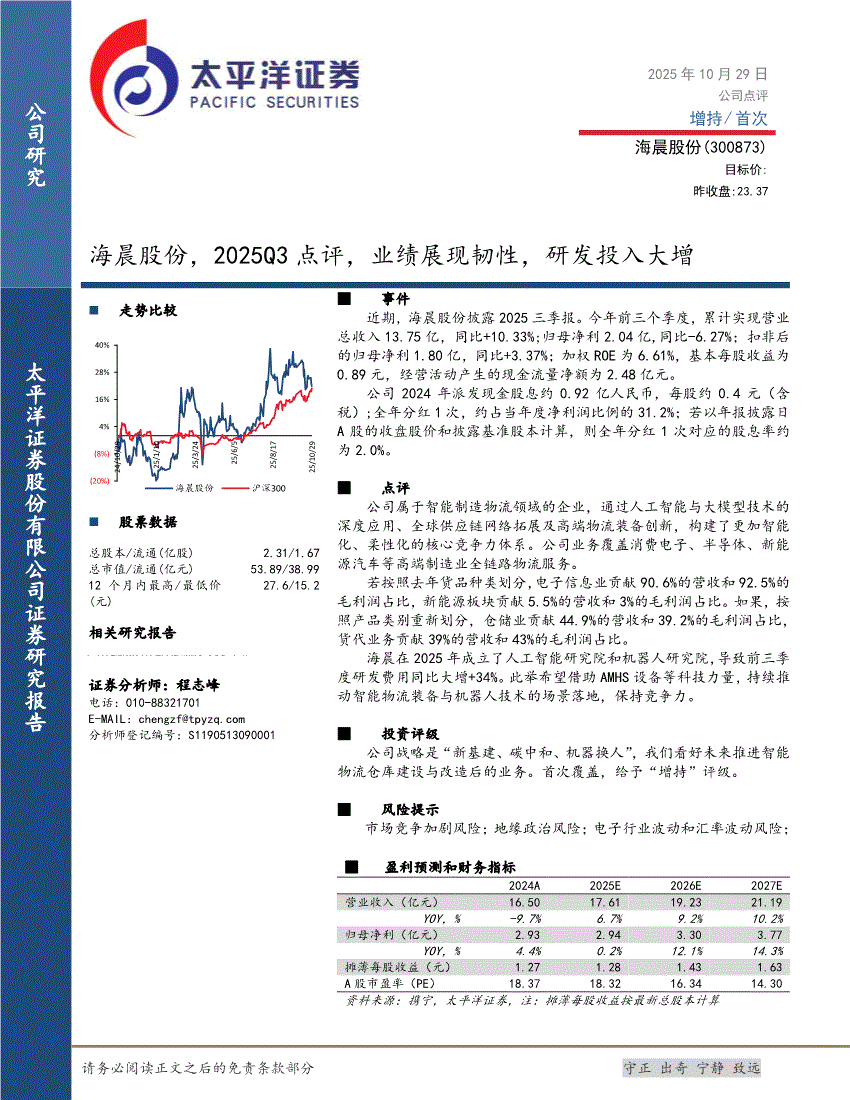 海晨股份:太平洋证券-海晨股份-300873-2025Q3点评:业绩展现韧性,研发投入大增-251029