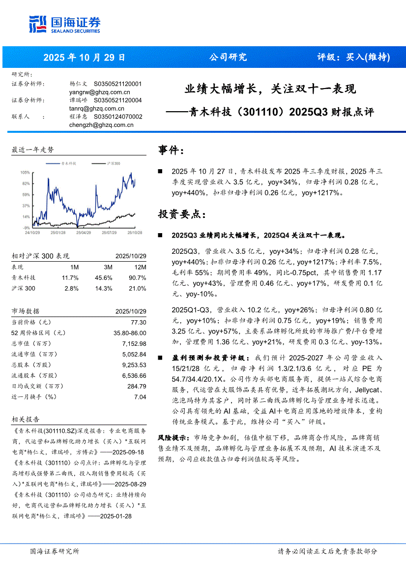 青木科技:国海证券-青木科技-301110-2025Q3财报点评:业绩大幅增长,关注双十一表现-251029