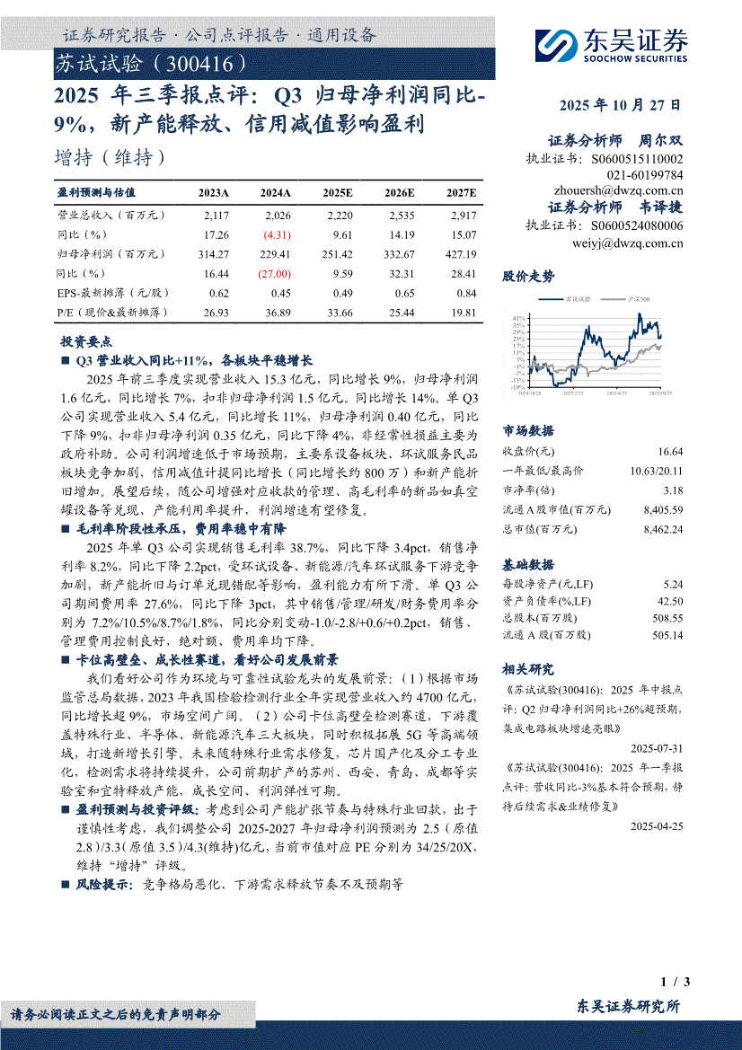 苏试试验:东吴证券-苏试试验-300416-2025年三季报点评:Q3归母净利润同比下降9%,新产能释放、信用减值影响盈利-251027