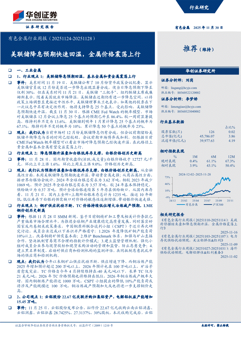 有色金属行业:华创证券-有色金属行业周报:美联储降息预期快速回温,金属价格震荡上行-251130