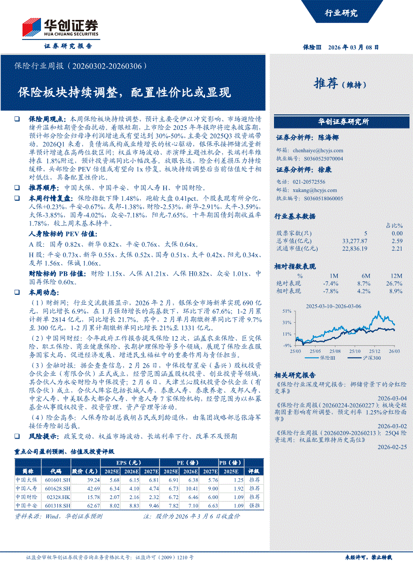 保险行业:华创证券-保险行业周报:保险板块持续调整,配置性价比或显现-260308