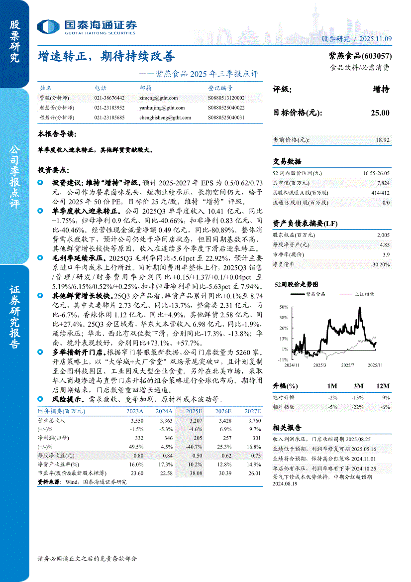 紫燕食品:国泰海通证券-紫燕食品-603057-2025年三季报点评:增速转正,期待持续改善-251109