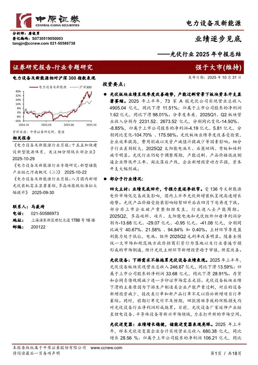 光伏行业:中原证券-光伏行业2025年中报总结:业绩逐步见底-251031