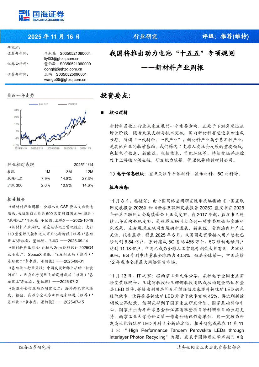 新材料行业:国海证券-新材料行业产业周报:我国将推出动力电池“十五五”专项规划-251116
