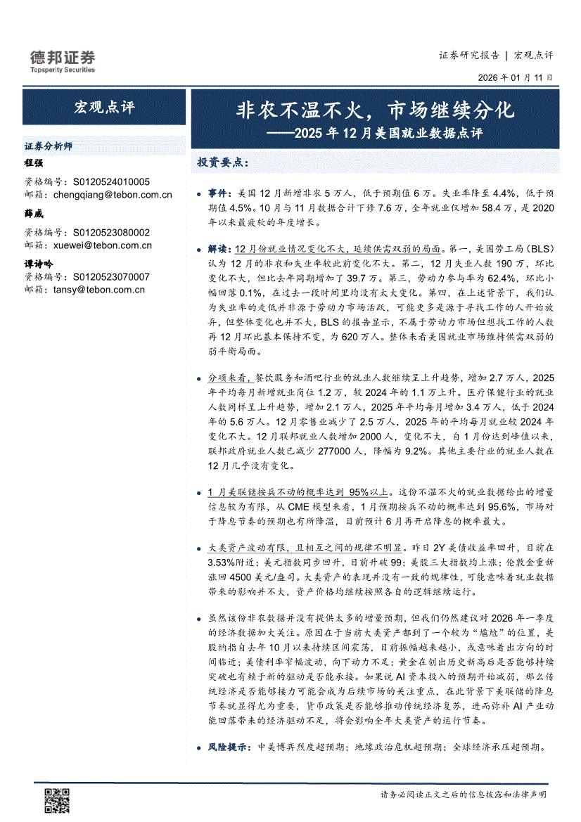 德邦证券-2025年12月美国就业数据点评:非农不温不火,市场继续分化-260111