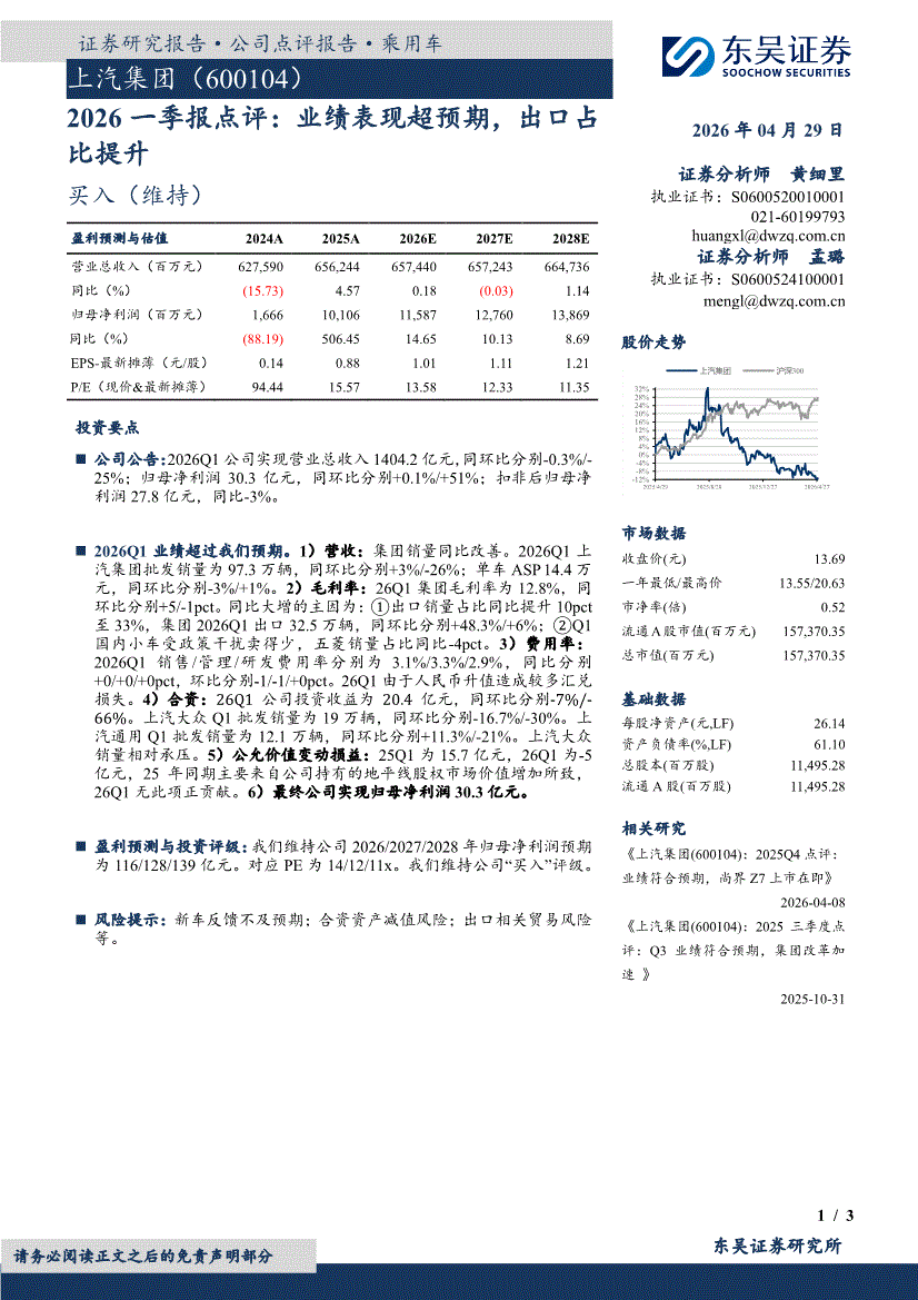 上汽集团:东吴证券-上汽集团-600104-2026一季报点评:业绩表现超预期,出口占比提升-260429