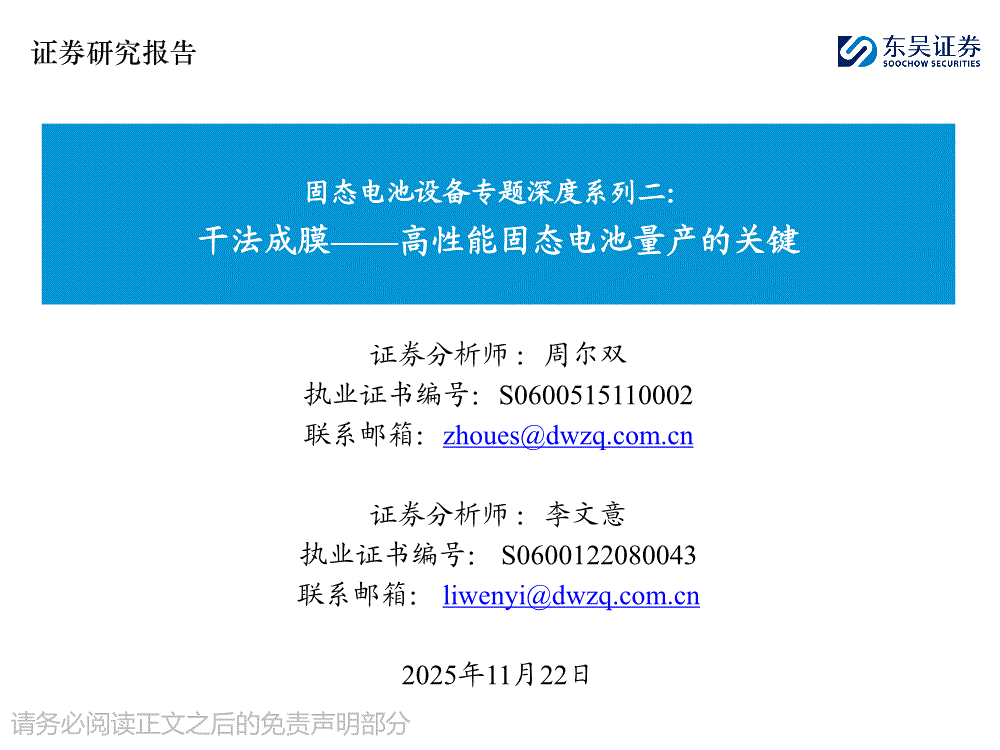固态电池设备行业:东吴证券-固态电池设备行业专题深度系列二:干法成膜——高性能固态电池量产的关键-251122