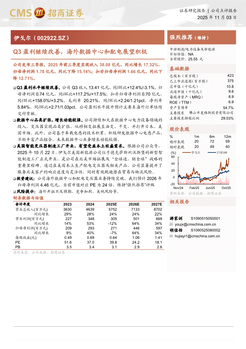 招商证券-伊戈尔-002922-Q3盈利继续改善,海外数据中心和配电展望积极-251103