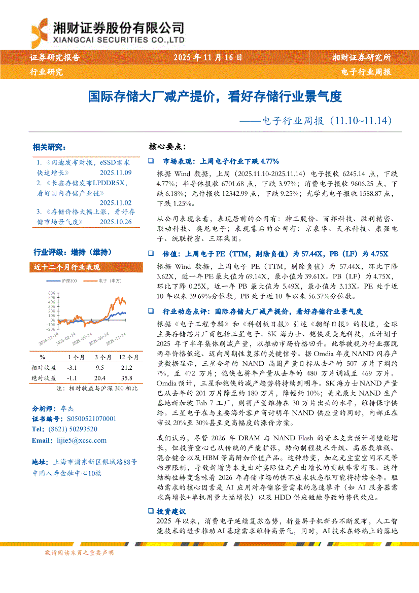 电子行业:湘财证券-电子行业周报:国际存储大厂减产提价,看好存储行业景气度-251116