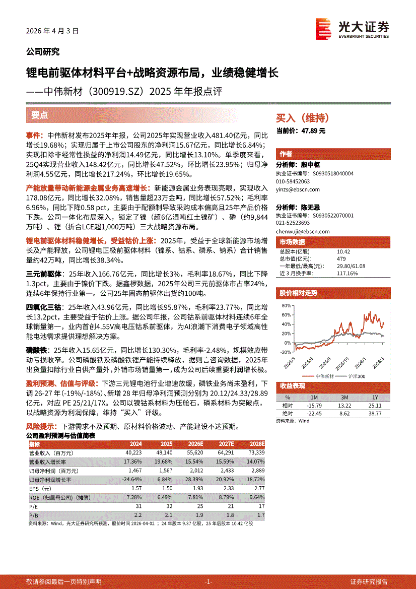 中伟新材:光大证券-中伟新材-300919-2025年年报点评:锂电前驱体材料平台+战略资源布局,业绩稳健增长-260403