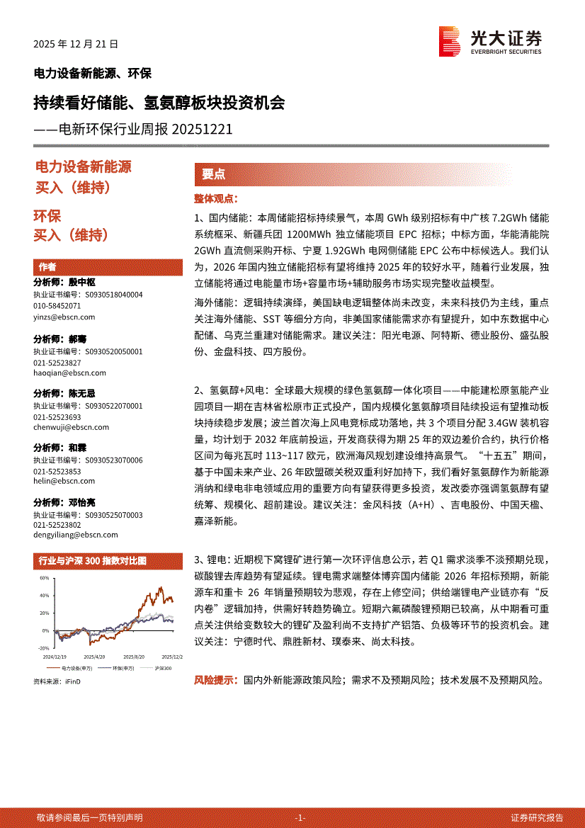 电新环保行业:光大证券-电新环保行业周报:持续看好储能、氢氨醇板块投资机会-251221