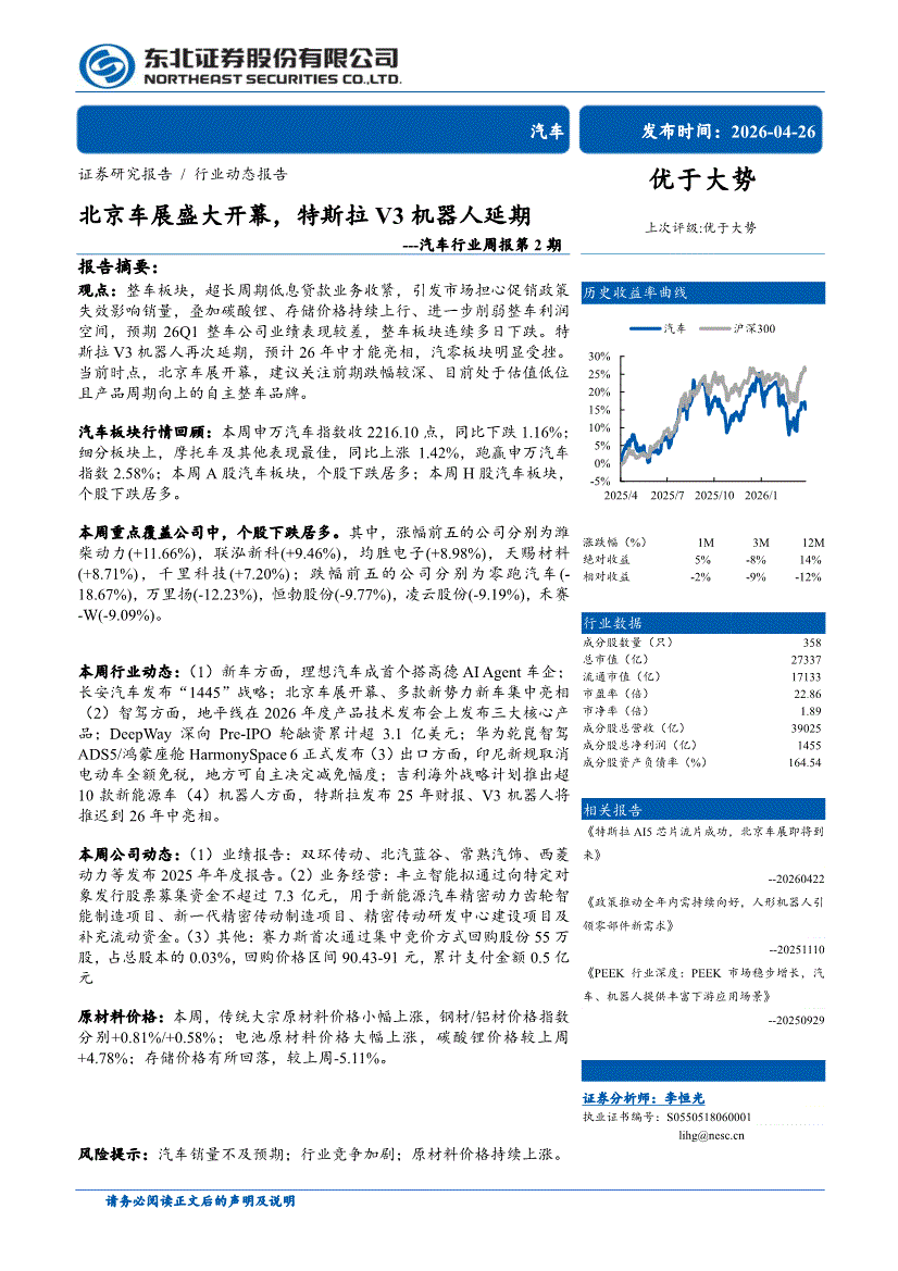 汽车行业:东北证券-汽车行业周报第2期:北京车展盛大开幕,特斯拉V3机器人延期-260426
