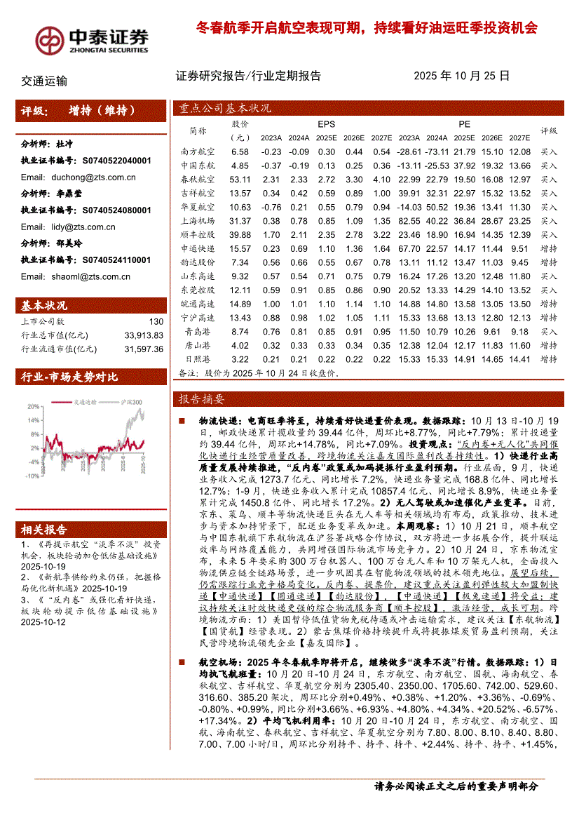 交通运输行业:中泰证券-交通运输行业:冬春航季开启航空表现可期,持续看好油运旺季投资机会-251025
