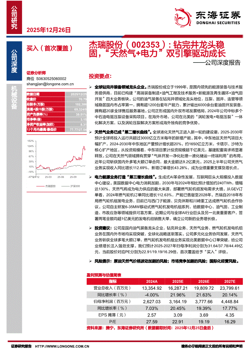 杰瑞股份:东海证券-杰瑞股份-002353-公司深度报告:钻完井龙头稳固,“天然气+电力”双引擎驱动成长-251226