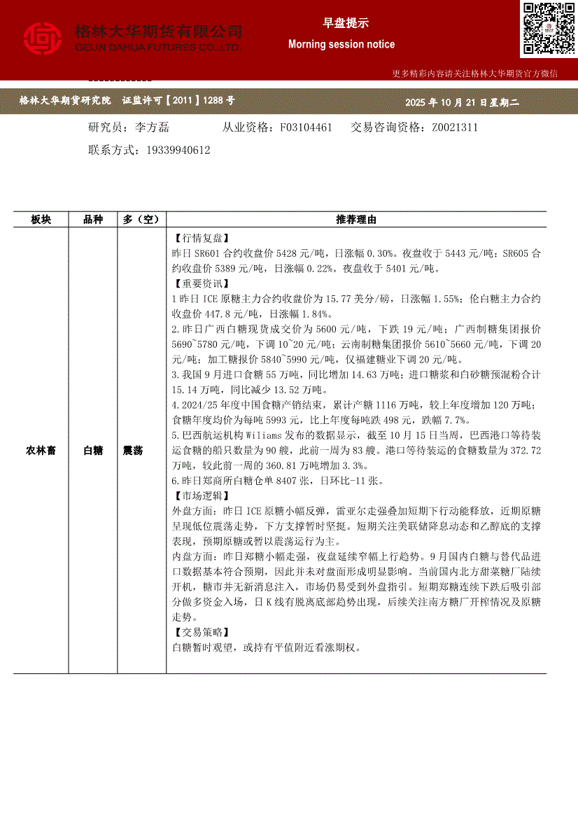 格林大华期货-早盘提示~白糖红枣橡胶-251030