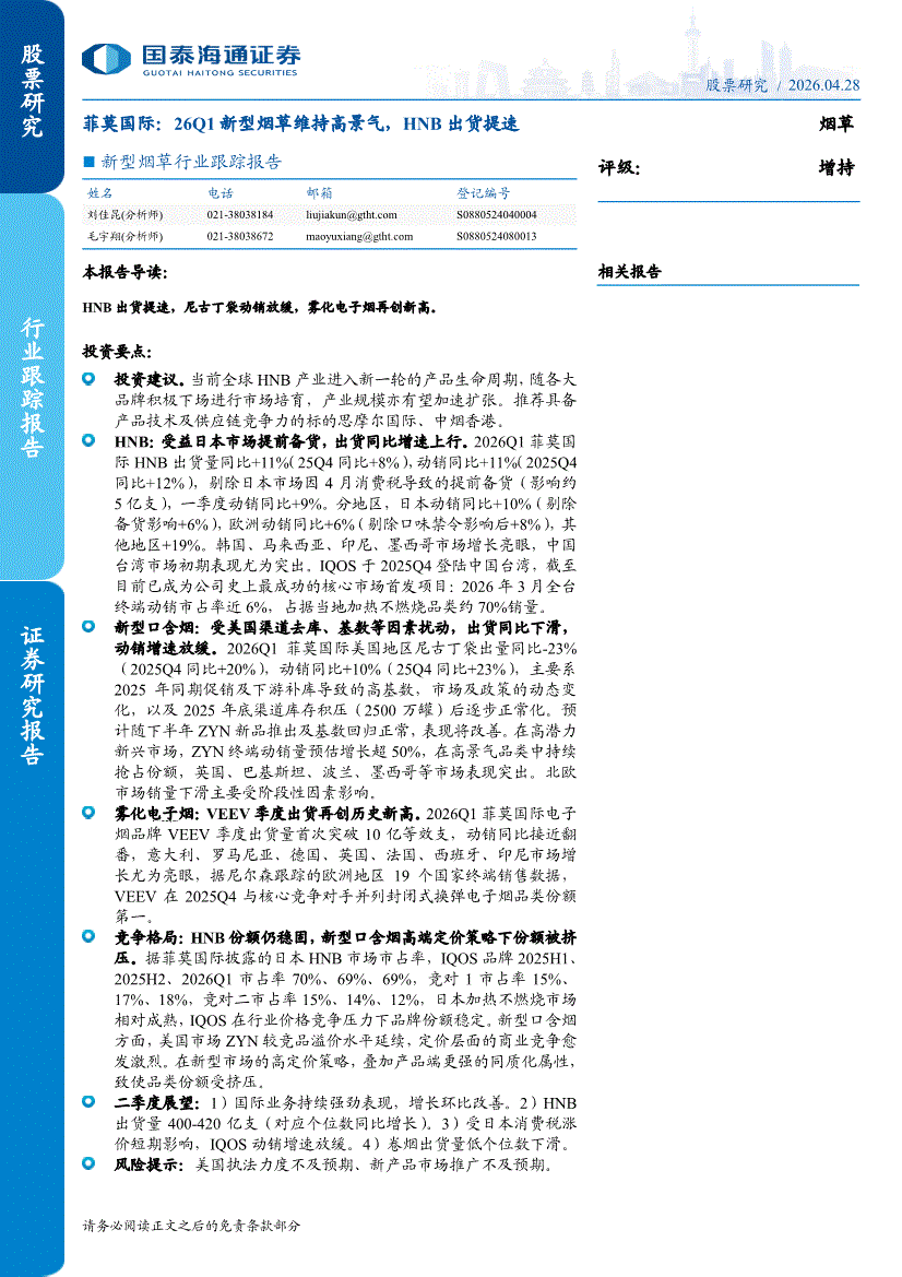 新型烟草行业:国泰海通证券-新型烟草行业跟踪报告:菲莫国际,26Q1新型烟草维持高景气,HNB出货提速-260428