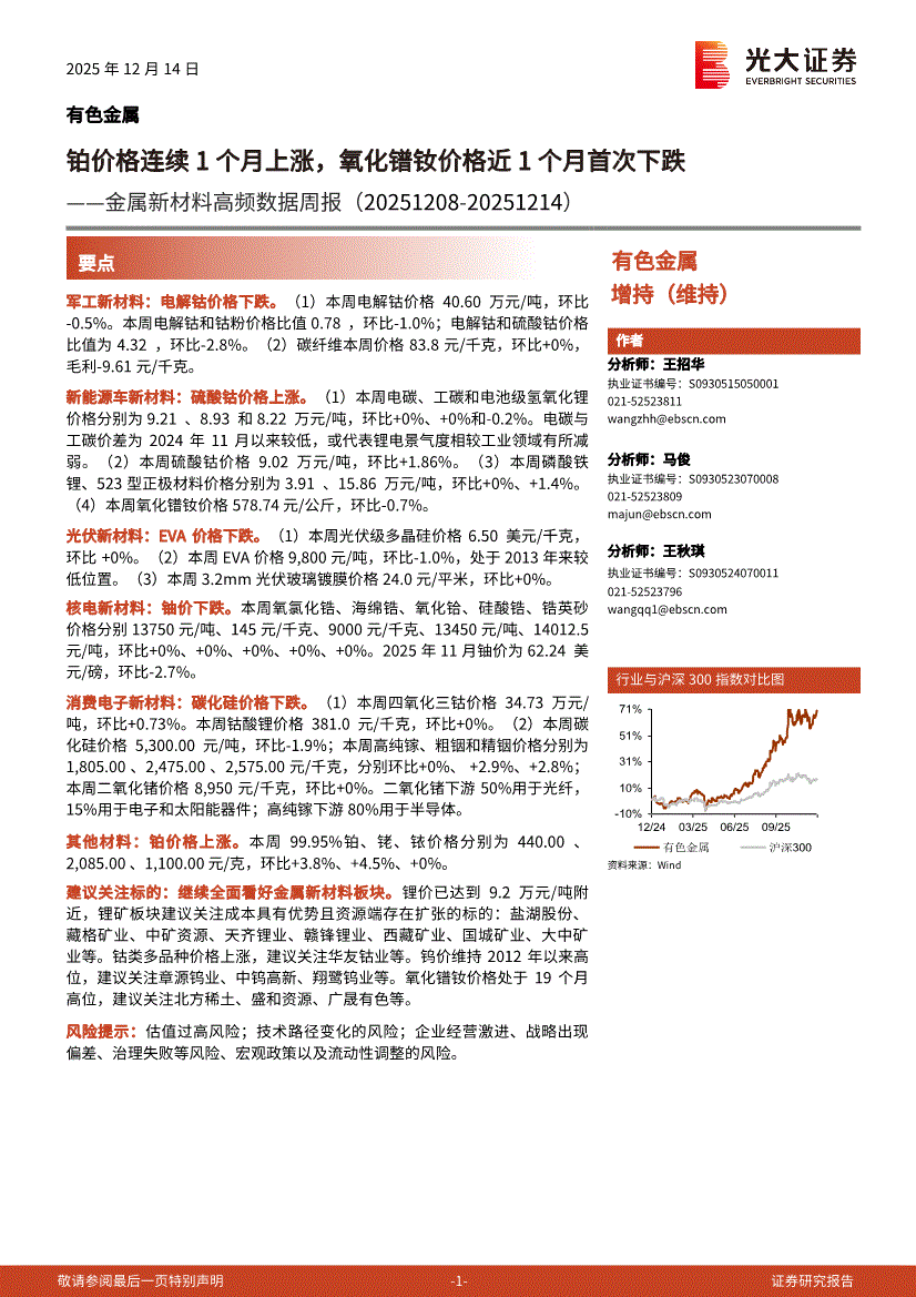有色金属行业:光大证券-有色金属行业金属新材料高频数据周报:铂价格连续1个月上涨,氧化镨钕价格近1个月首次下跌-251214