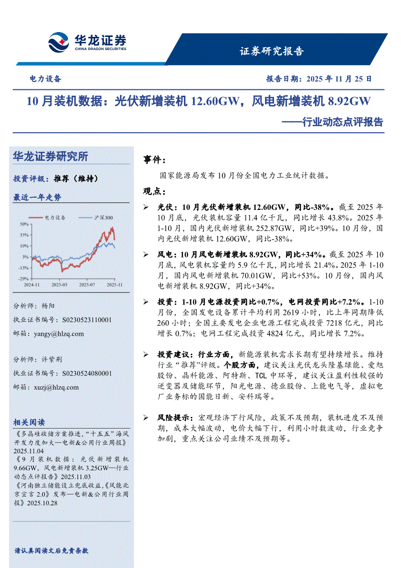 电力设备行业:华龙证券-电力设备行业动态点评报告:10月装机数据,光伏新增装机12.60GW,风电新增装机8.92GW-251125