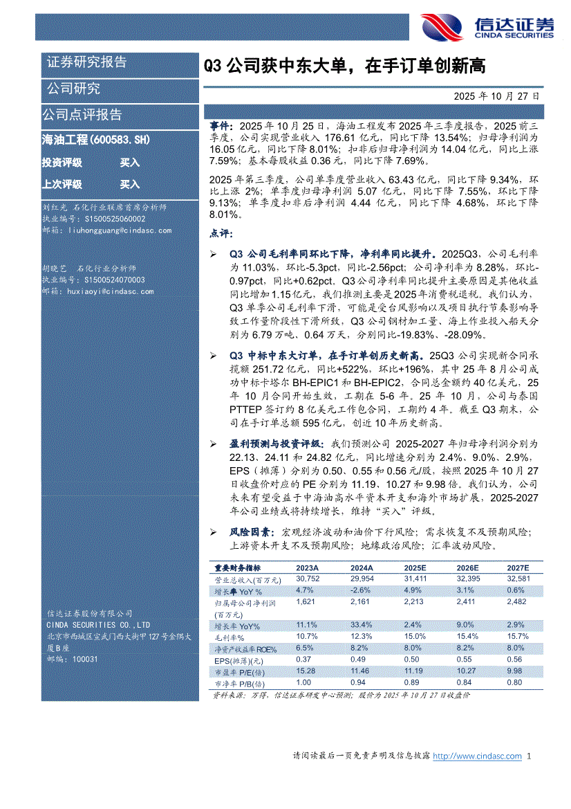 海油工程:信达证券-海油工程-600583-Q3公司获中东大单,在手订单创新高-251027