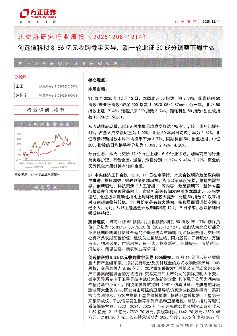 北交所行业:方正证券-北交所研究行业周报:创远信科拟8.86亿元收购微宇天导,新一轮北证50成分调整下周生效-251214
