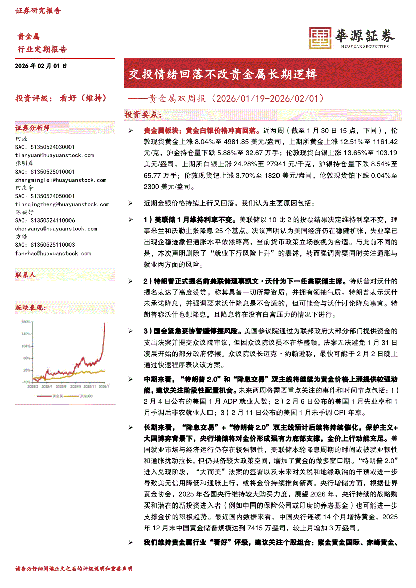 贵金属行业:华源证券-贵金属行业双周报:交投情绪回落不改贵金属长期逻辑-260201