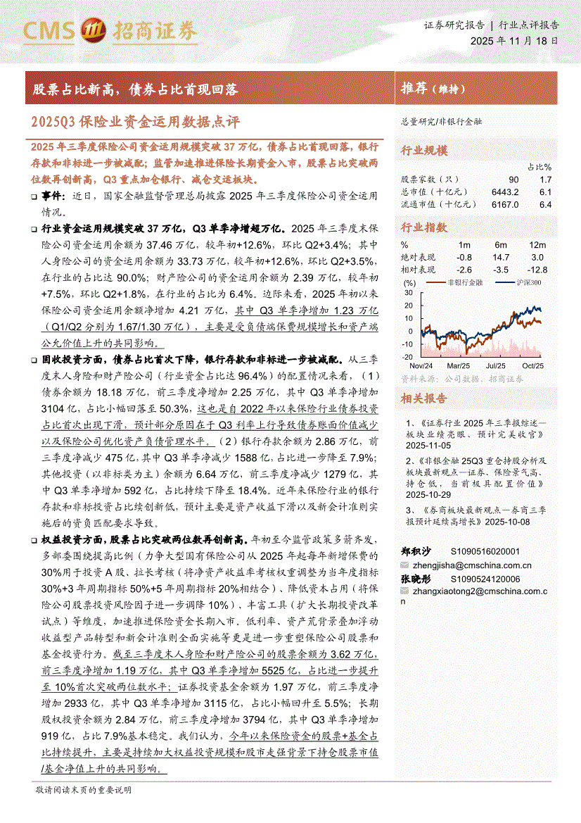 非银行金融行业:招商证券-非银行金融行业2025Q3保险业资金运用数据点评:股票占比新高,债券占比首现回落-251118