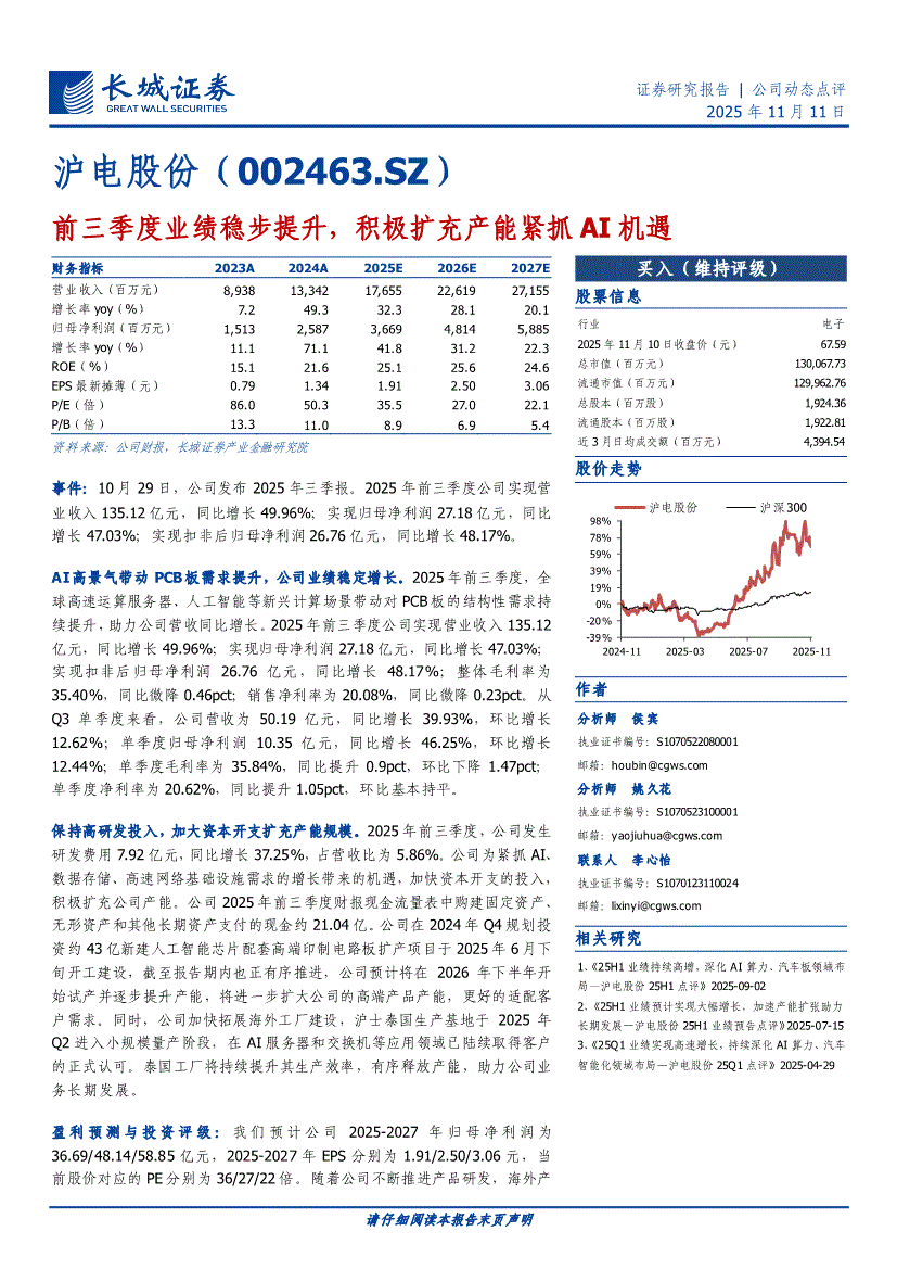 沪电股份:长城证券-沪电股份-002463-前三季度业绩稳步提升,积极扩充产能紧抓AI机遇-251111