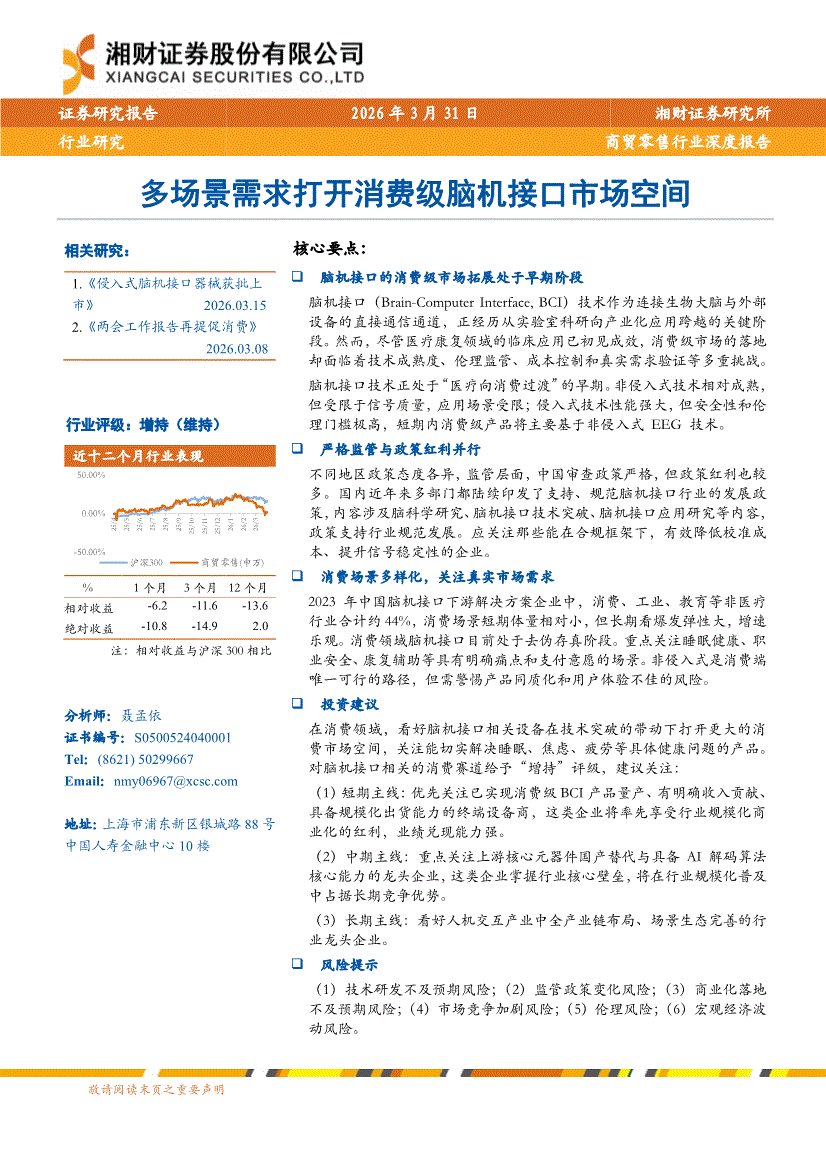 商贸零售行业:湘财证券-商贸零售行业深度报告:多场景需求打开消费级脑机接口市场空间-260331