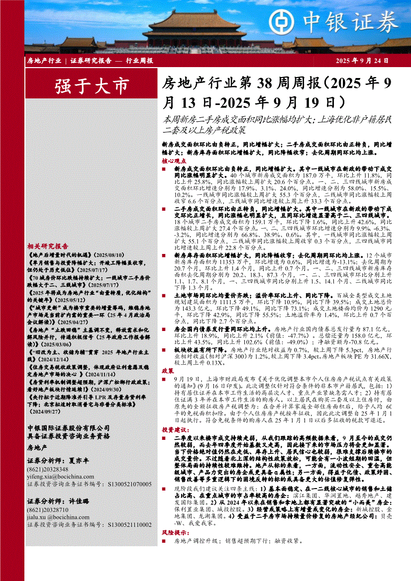 房地产行业:中银国际-房地产行业第38周周报(2025年9月13日~2025年9月19日):本周新房二手房成交面积同比涨幅均扩大;上海优化非户籍居民二套及以上房产税政策-250924
