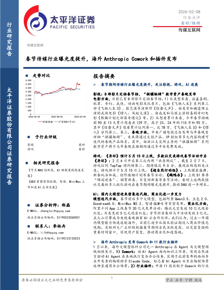 传媒互联网行业:太平洋证券-传媒互联网行业:春节传媒行业曝光度提升,海外Anthropic Cowork和插件发布-260208
