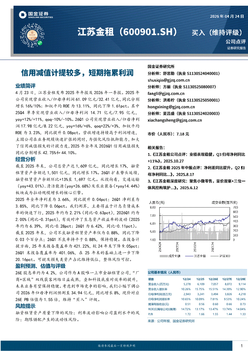 江苏金租:国金证券-江苏金租-600901-信用减值计提较多,短期拖累利润-260424