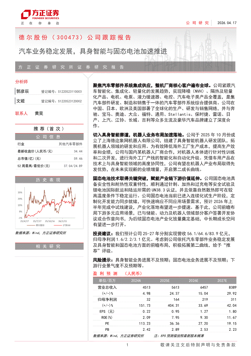 德尔股份:方正证券-德尔股份-300473-公司跟踪报告:汽车业务稳定发展,具身智能与固态电池加速推进-260417