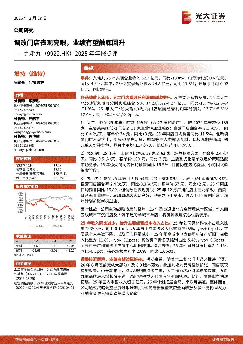 九毛九:光大证券-九毛九-9922.HK-2025年年报点评:调改门店表现亮眼,业绩有望触底回升-260328