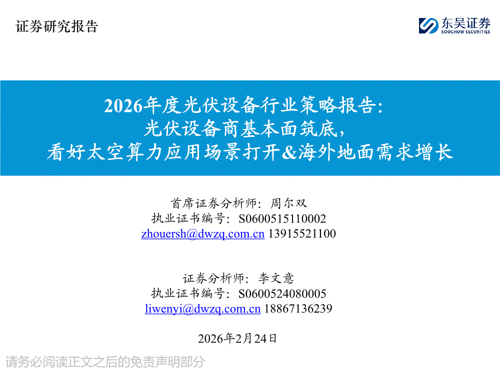 光伏设备行业:东吴证券-2026年度光伏设备行业策略报告:光伏设备商基本面筑底,看好太空算力应用场景打开&海外地面需求增长-260224