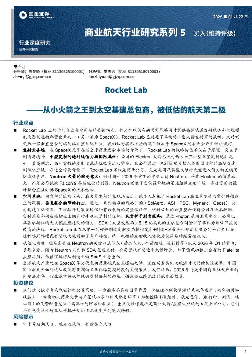 商业航天行业:国金证券-商业航天行业研究系列5:Rocket Lab——从小火箭之王到太空基建总包商,被低估的航天第二极-260123