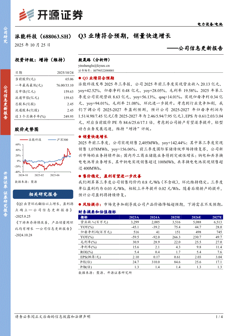 派能科技:开源证券-派能科技-688063-公司信息更新报告:Q3业绩符合预期,销量快速增长-251025