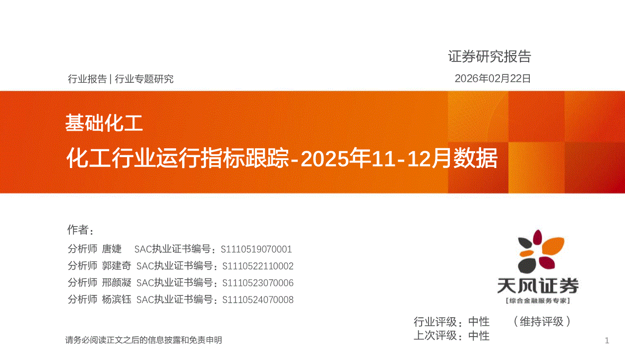 化工行业:天风证券-化工行业运行指标跟踪:2025年11~12月数据-260222