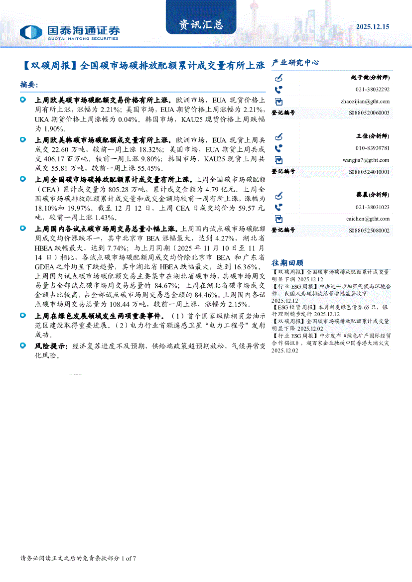 国泰海通证券-资讯汇总:【双碳周报】全国碳市场碳排放配额累计成交量有所上涨-251215