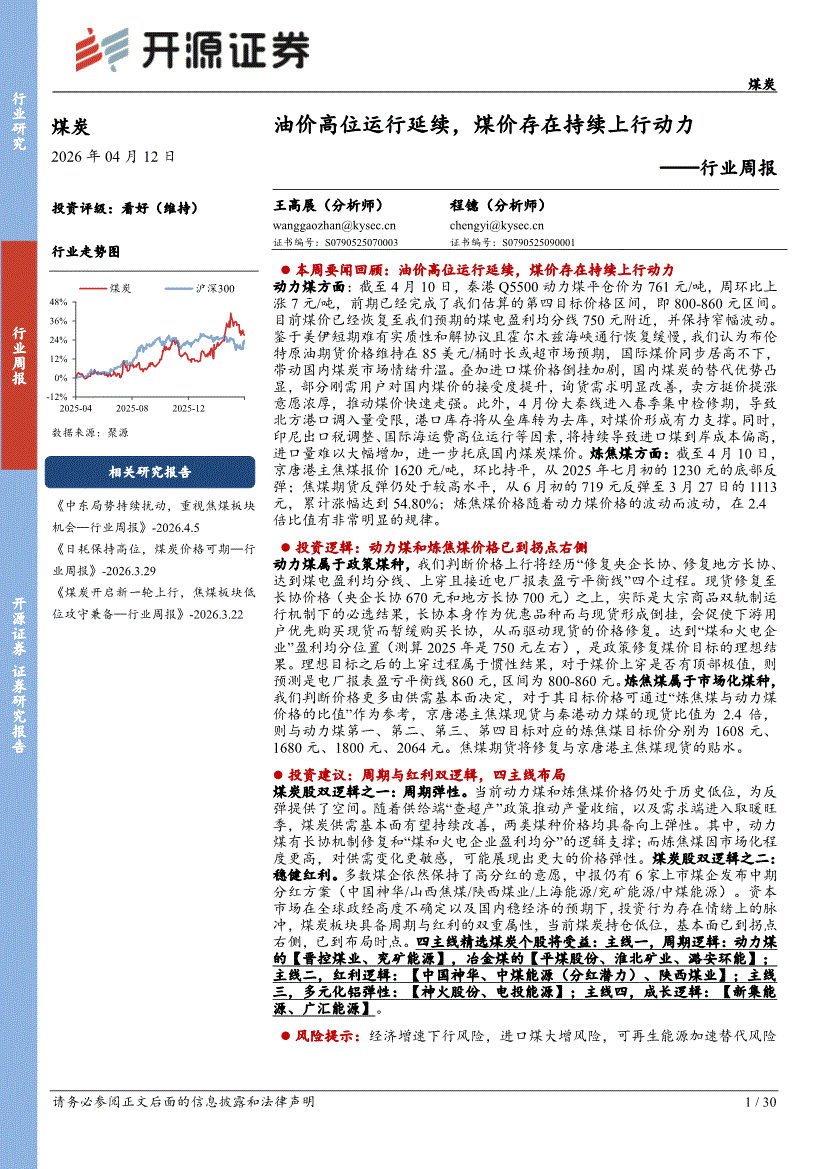 煤炭行业:开源证券-煤炭行业周报:油价高位运行延续,煤价存在持续上行动力-260412