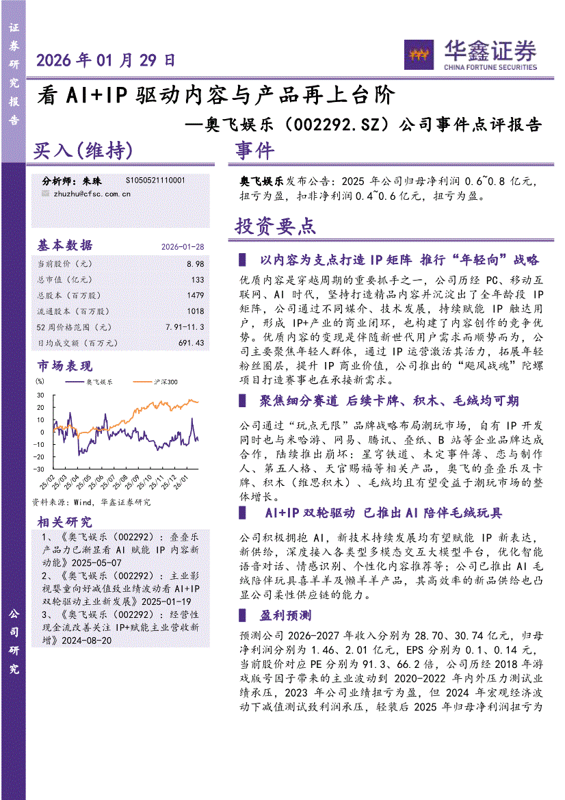 奥飞娱乐:华鑫证券-奥飞娱乐-002292-公司事件点评报告:看AI+IP驱动内容与产品再上台阶-260129