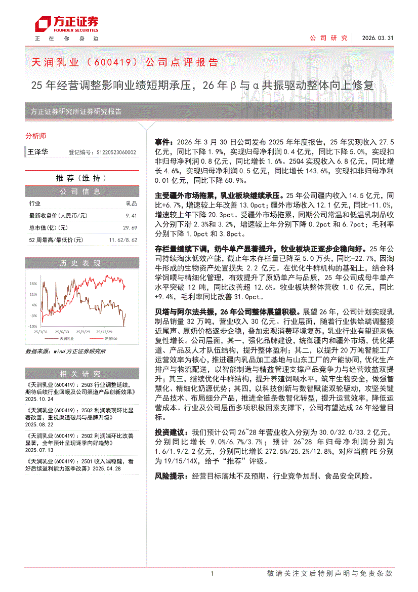 天润乳业:方正证券-天润乳业-600419-公司点评报告:25年经营调整影响业绩短期承压,26年β与α共振驱动整体向上修复-260331