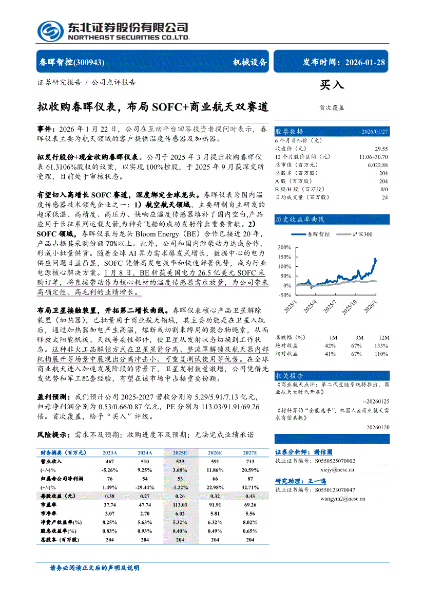 春晖智控:东北证券-春晖智控-300943-拟收购春晖仪表,布局SOFC+商业航天双赛道-260128
