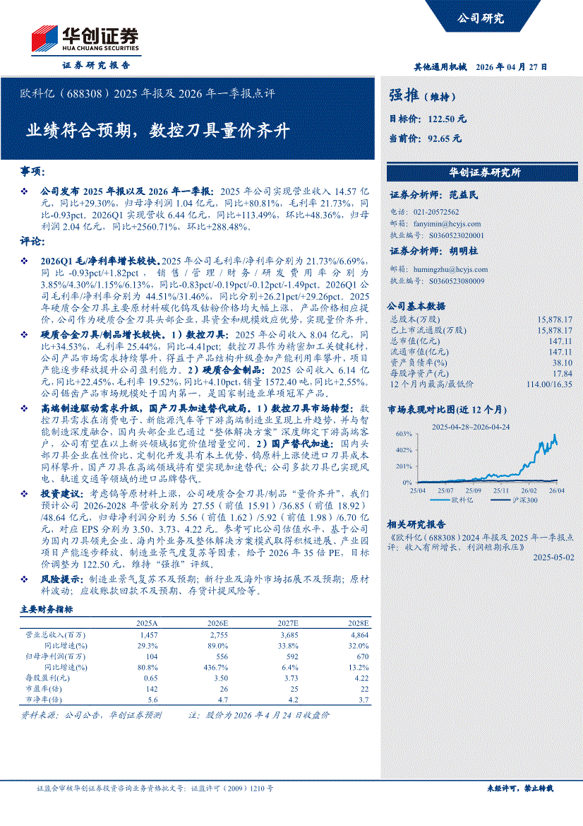 欧科亿:华创证券-欧科亿-688308-2025年报及2026年一季报点评:业绩符合预期,数控刀具量价齐升-260427