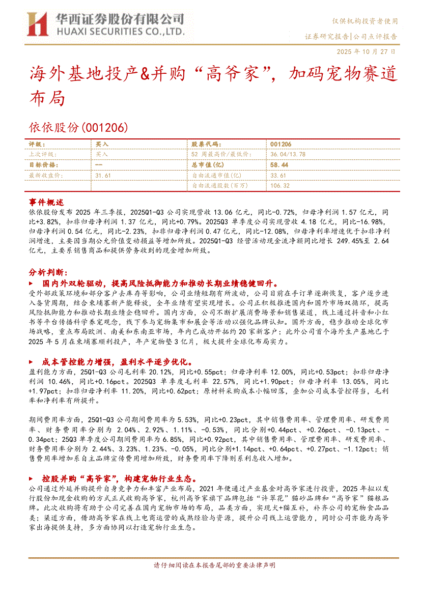 依依股份:华西证券-依依股份-001206-海外基地投产&并购“高爷家”,加码宠物赛道布局-251027