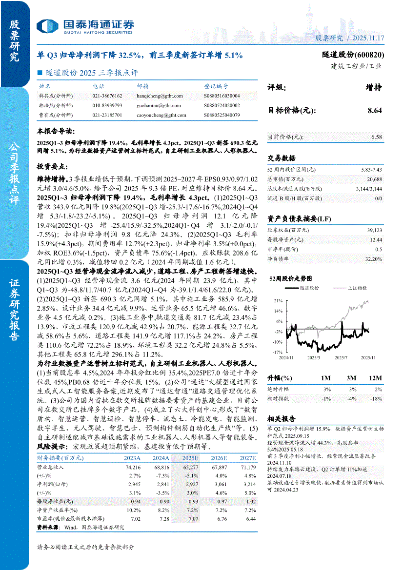隧道股份:国泰海通证券-隧道股份-600820-2025三季报点评:单Q3归母净利润下降32.5%,前三季度新签订单增5.1%-251117