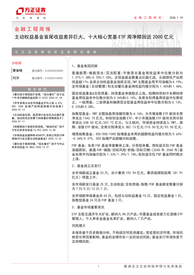 方正证券-金融工程周报:主动权益基金首尾收益差异巨大,十大核心宽基ETF周净赎回近2000亿元-260119