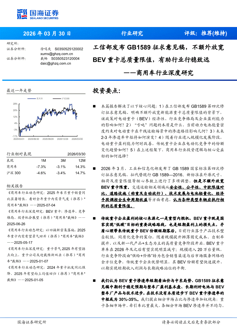 商用车行业:国海证券-商用车行业深度研究:工信部发布GB1589征求意见稿,不额外放宽BEV重卡总质量限值,有助行业行稳致远-260330