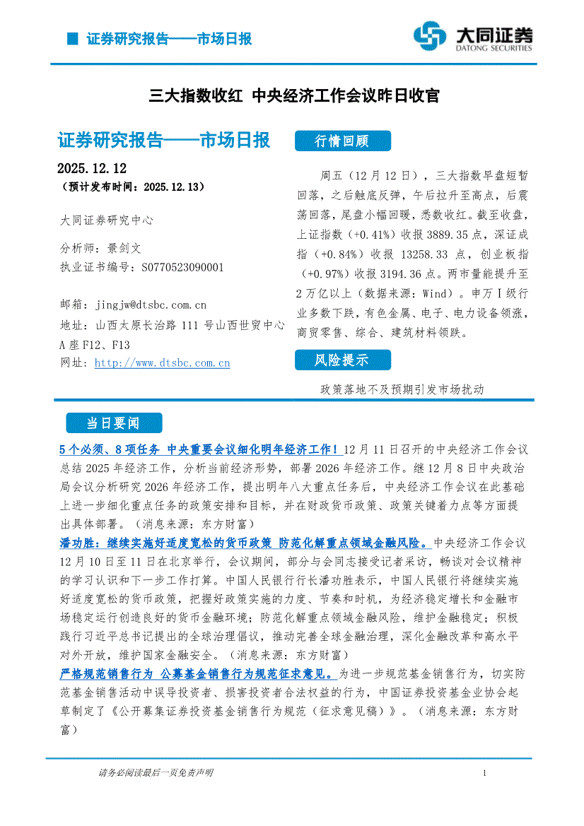 大同证券-市场日报:三大指数收红,中央经济工作会议昨日收官-251213